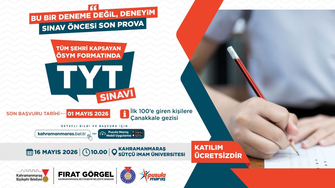 Gençlerin hem akademik hem de kültürel gelişimlerini desteklemeyi amaçlayan bu organizasyon, öğrencilere motivasyon kazandırmayı da hedefliyor. Özellikle sınav sürecinde olan gençlerin kendilerini deneme, zaman yönetimini geliştirme ve sınav stresini azaltma açısından önemli bir fırsat olarak öne çıkıyor. Katılımın tamamen ücretsiz olduğu TYT deneme sınavına başvurular çevrimiçi olarak alınmaya başladı. Sınava katılmak isteyen öğrenciler, https://kahramanmaras.bel.tr/duyuru/2026/04/20/pusula-maras-tyt-deneme-sinavi-basvuru-formu internet adresinden başvuru formunu doldurarak kayıtlarını gerçekleştirebiliyor. Başvurular için son tarih ise 1 Mayıs Cuma.
